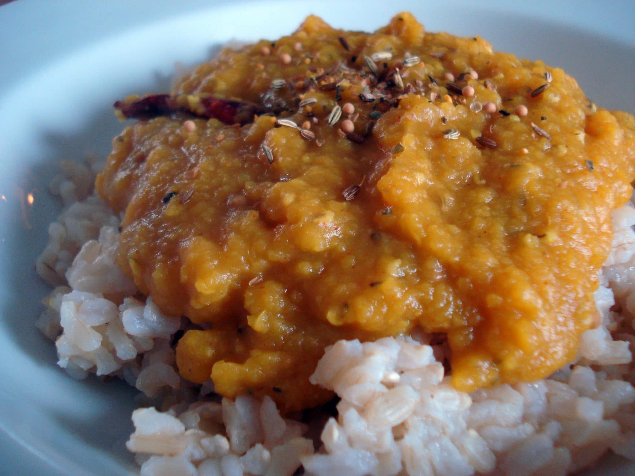 Red lentils are in fact red, but when cooked, they turn yellow. They also lose their form pretty quickly to produce a sort of “stew” texture, which is why regular brown lentils won’t really work here unless you cook them for much, much longer.