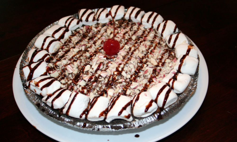Spread the mixture into the pie crust. Line the border with reserved marshmallows and sprinkle candy cane crumble in the center. Drizzle with chocolate syrup and top with a cherry if desired. Refrigerate until firm enough to slice.