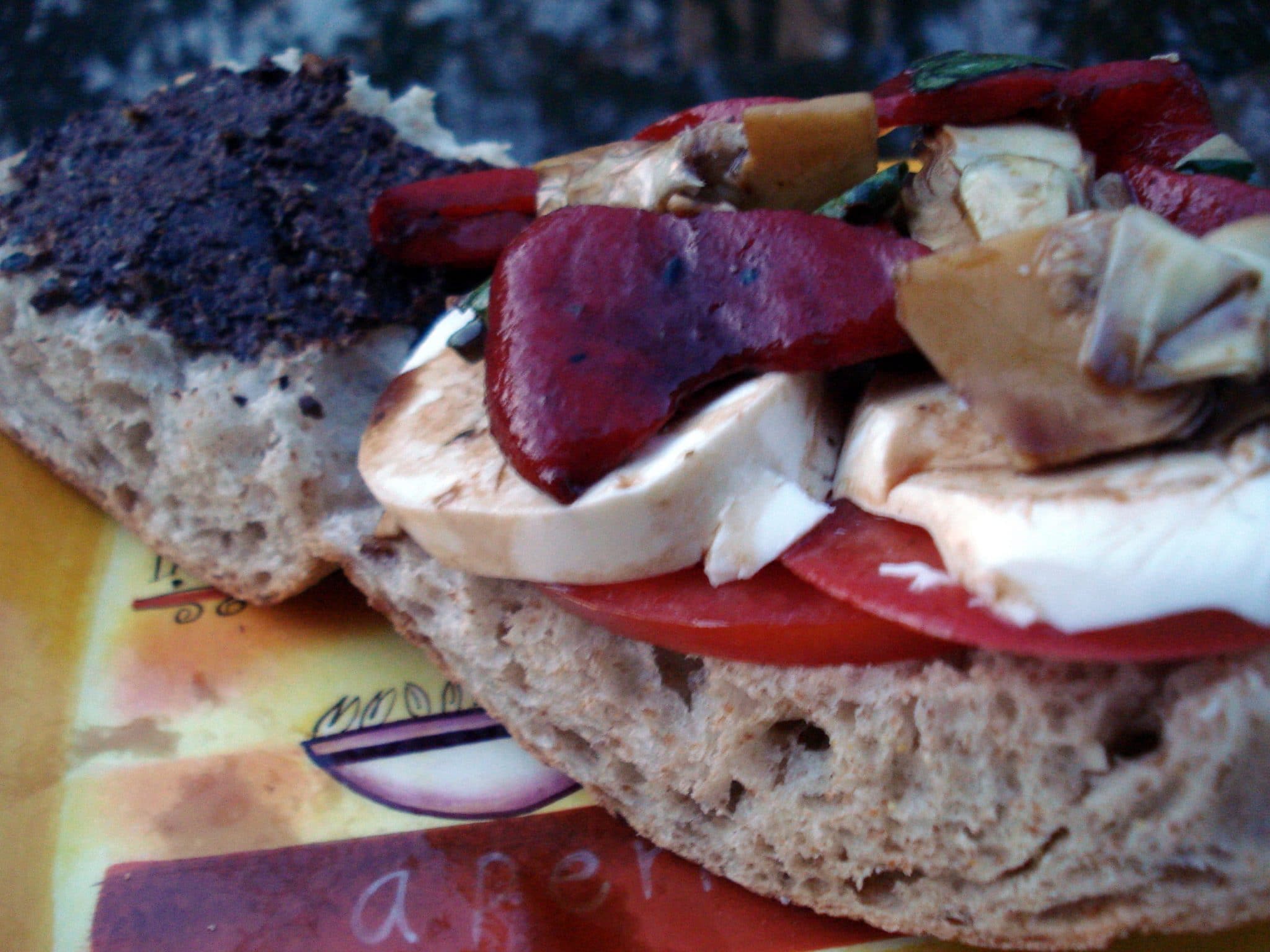 Muffalettas generally consist of roasted peppers, artichokes, tomatoes, or other vegetables, fresh mozzarella cheese, olive tapenade, balsamic vinaigrette (to put mayo or anything else on it is a sin!), and prosciutto or other meats. But no meat on this one. Actually, the only other place I’ve ever had a muffalatta serves theirs with no meat, so it’s not much of a stretch to make a meatless one.